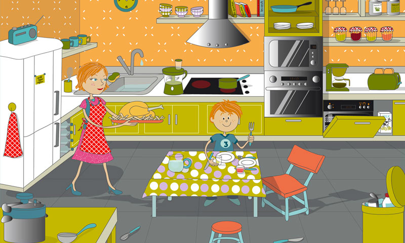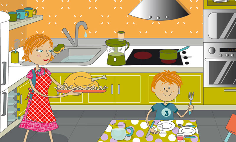 Miam ! Tu vas te régaler, maman a préparé du poulet et des frites… Vite, à table, avant que le repas ne refroidisse !
